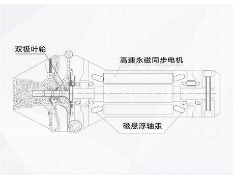 高速永磁同步電機直接驅(qū)動雙級葉輪,取消增速齒輪,運動部件少,在機組運行的范圍內(nèi),電機效率均達到96%以上,較高效率達97.5%,超過我國電機1級節(jié)能水平;提升效率4%。 |