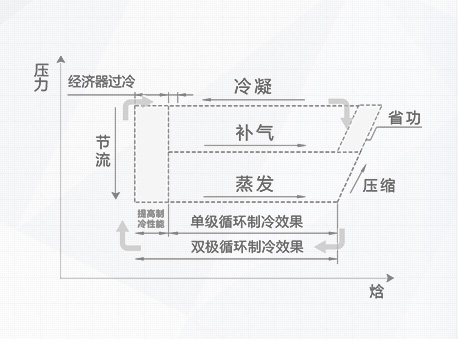 雙極壓縮中間補氣循環(huán) 雙極壓縮中間補氣循環(huán)制冷循環(huán)比單級壓縮制冷循環(huán)效率提高5%以上。 |