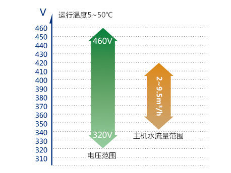 水側(cè)換熱器進(jìn)水范圍:5~50℃,主機(jī)水流量范圍:2~9.5m3/h,滿(mǎn)足全國(guó)大部分地區(qū)的地理環(huán)境使用要求;電壓范圍提升至320V-460V,遠(yuǎn)超342V-420V的國(guó)家標(biāo)準(zhǔn),輕松應(yīng)對(duì)電壓不穩(wěn)問(wèn)題。