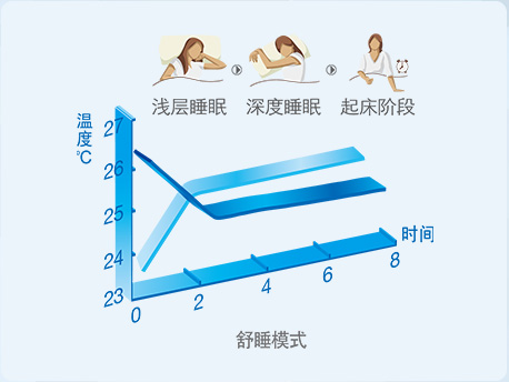 舒睡模式:在制冷模式下適當(dāng)提高溫度,在制熱模式下適當(dāng)降低溫度,貼合一般人群的體溫節(jié)律變化,睡眠更舒適。 |